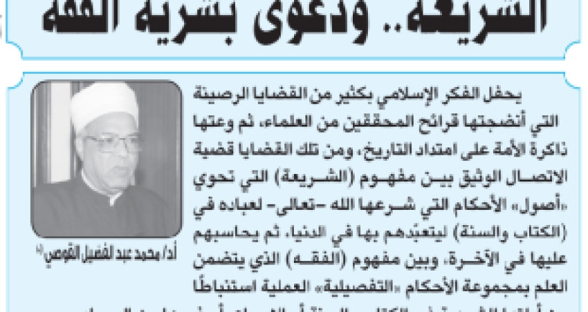 يحفل الفكر الإسلامي بكثير من القضايا الرصينة التي أنضجتها قرائح المحققين من العلماء، ثم وعتها ذاكرة الأمة على امتداد التاريخ، ومن تلك القضايا قضية الاتصال الوثيق بين مفهوم (الشريعة) التي تحوي أصول الأحكام التي شرعها الله تعالي لعباده في الكتاب والسنة، ليتعبدهم بها في الدنيا، ثم يحاسبهم عليها في الآخرة، وبين مفهوم الفقه التي يتضمن العلم بمجموعة الأحكام التفصيلية العملية استنباطًا من أدلتها الشرعية في: الكتاب والسنة أو الإجماع، أو غيرها من المصادر.