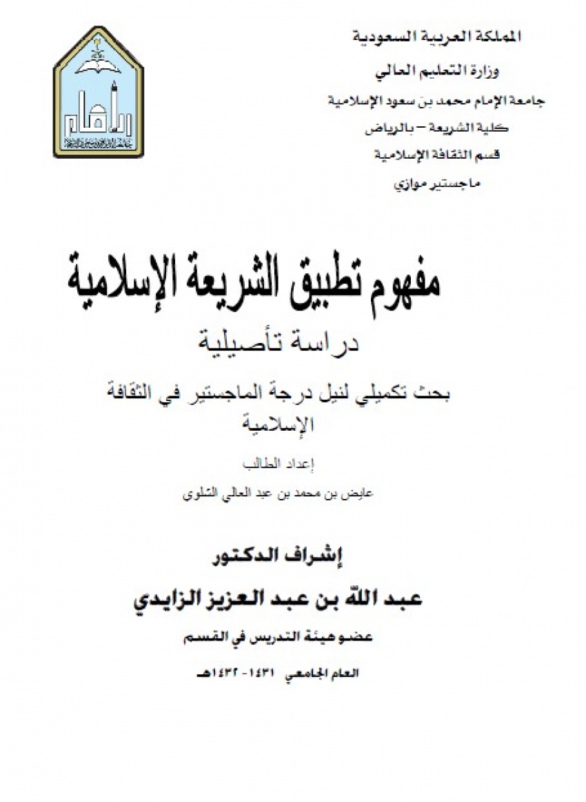 تأتي هذه الدراسة ضمن متطلبات نيل درجة الماجستير في الثقافة الإسلامية بكلية الشريعة جامعة الإمام محمد بن سعود؛ بهدف تحرير مصطلح تطبيق الشريعة الإسلامية ومفهومه. وتجلية هذا المفهوم وتوضيحه فكريًا ليسهل التعامل معه من خلال رؤية شرعية إسلامية واضحة المعالم. وإبراز تفوق التشريع الإسلامي وتميزه على غيره من التشريعات الوضعية وأنه صالح للتطبيق في كل زمان ومكان.
